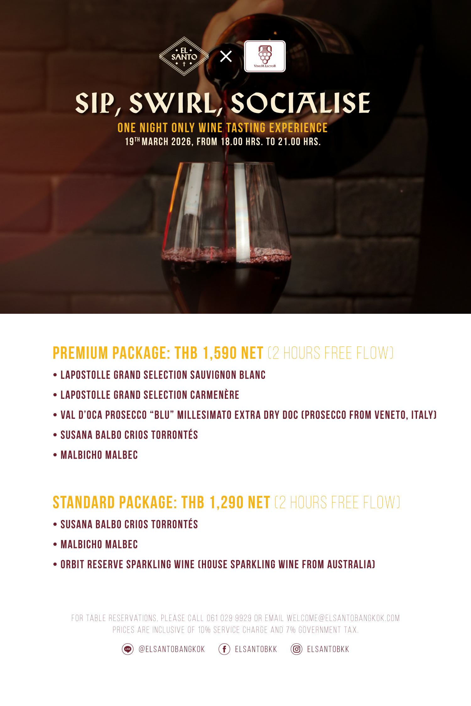 Turn your midweek into something worth dressing up for. Join us at El Santo Bangkok for a vibrant wine tasting night in collaboration with VINUM LECTOR, featuring bold selections from Italy, Chile and Argentina - poured free flow and meant to be shared.