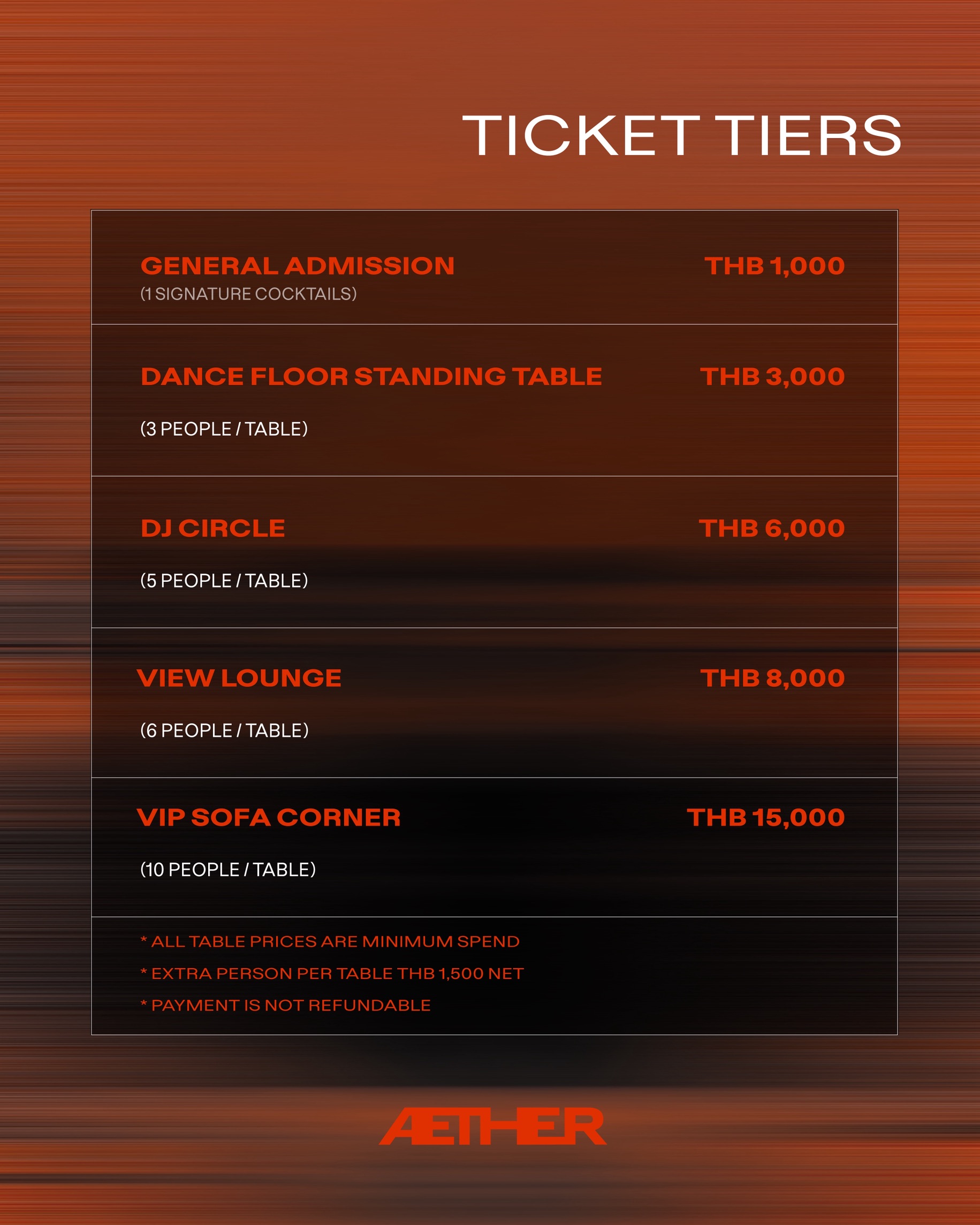 • ÆTHER reserves the right to amend these terms and conditions at any time. Additional event details will be communicated accordingly.