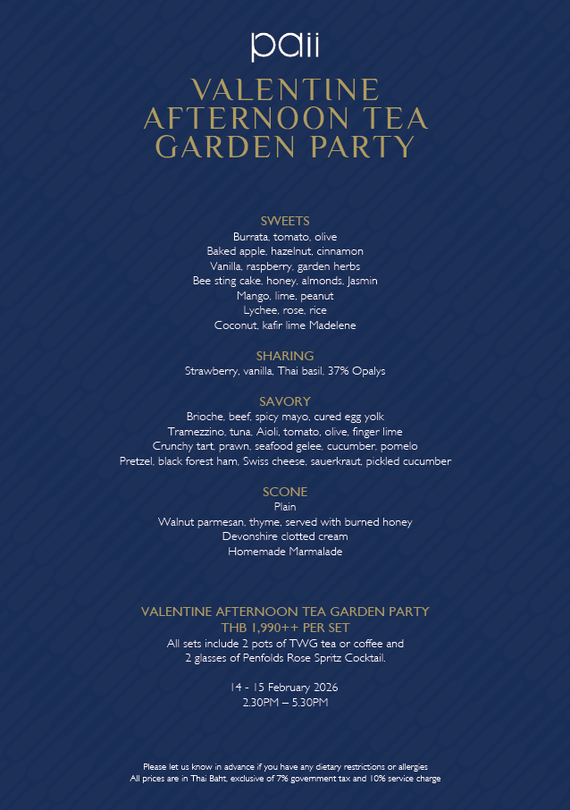 Celebrate love in a romantic garden setting with live music and an elegant Valentine Afternoon Tea. Enjoy a curated selection of sweet and savory delights, including burrata with tomato and olive, prawn tart with seafood gelée, beef brioche, freshly baked scones with clotted cream, and handcrafted Valentine desserts.